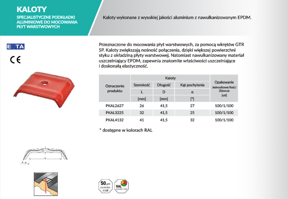 Przeznaczone do mocowania płyt warstwowych, za pomocą wkrętów GTR SP. Kaloty zwiększają nośność połączenia, dzięki większej powierzchni styku z okładziną płyty warstwowej.